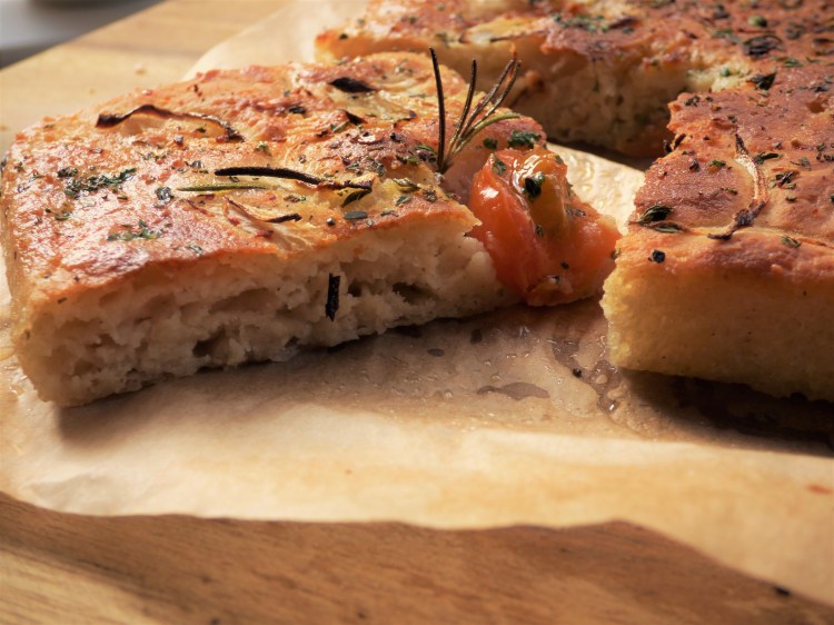 My focaccia recipe contains a blend of different gluten free flours along with the essential xanthan gum to create a bread that is full of big bubbles and has a chew reminiscent of a regular focaccia. My secret is a dough that is more like a batter, this allows the yeast to form big bubbles and air pockets like a regular focaccia.