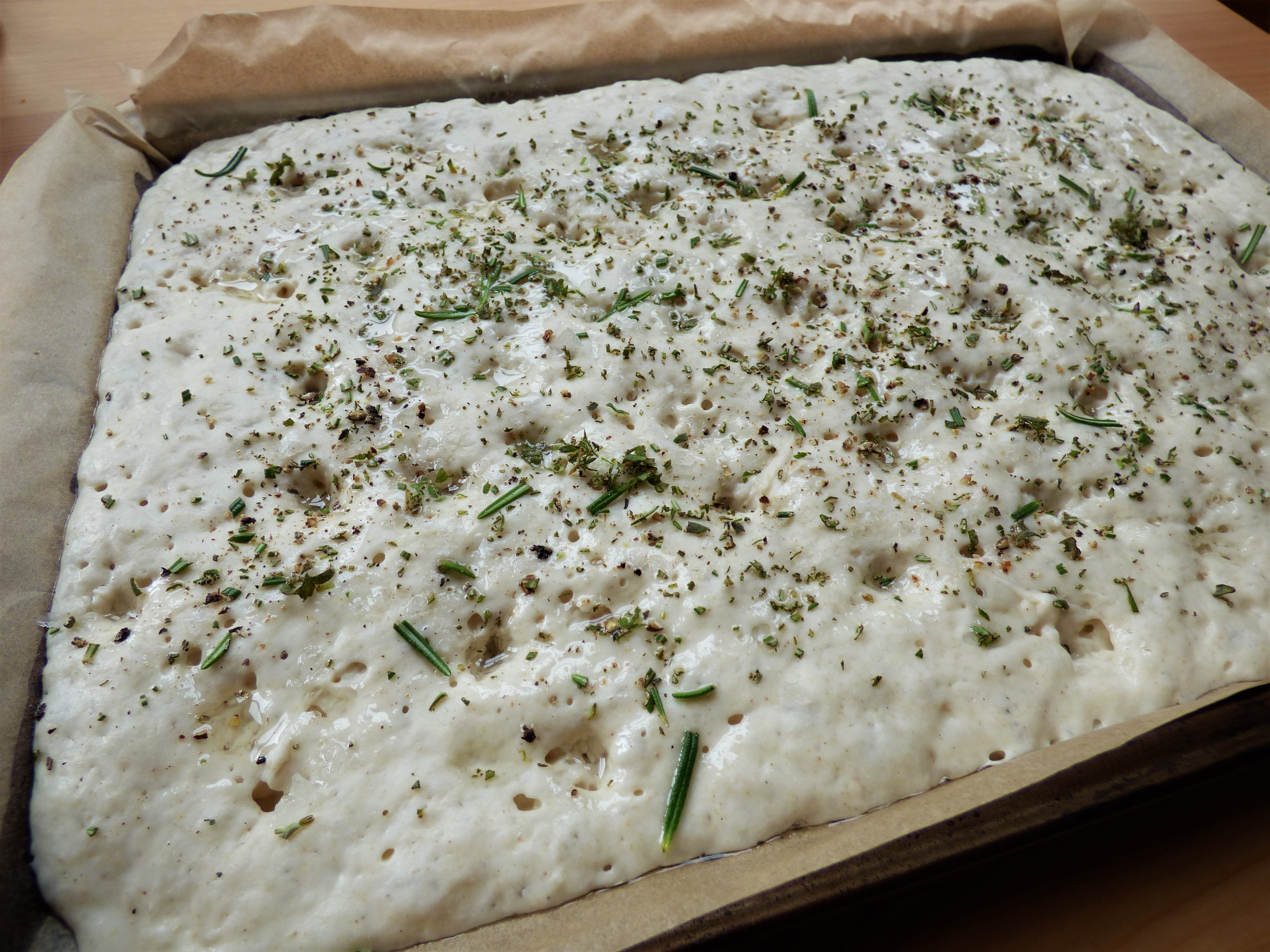 - Line a 12-inch rectangular baking pan with parchment and cover the bottom of the lined pan with olive oil. If you prefer a thicker focaccia, use an 8-inch pan and bake for 5-10 minutes longer. Pour your mixture into the pan, pushing it as far to the corners and sides as possible, and let prove for half an hour. Don’t worry if it doesn’t quite reach the sides and the corners, as it is such a wet dough it will spread as it proves.