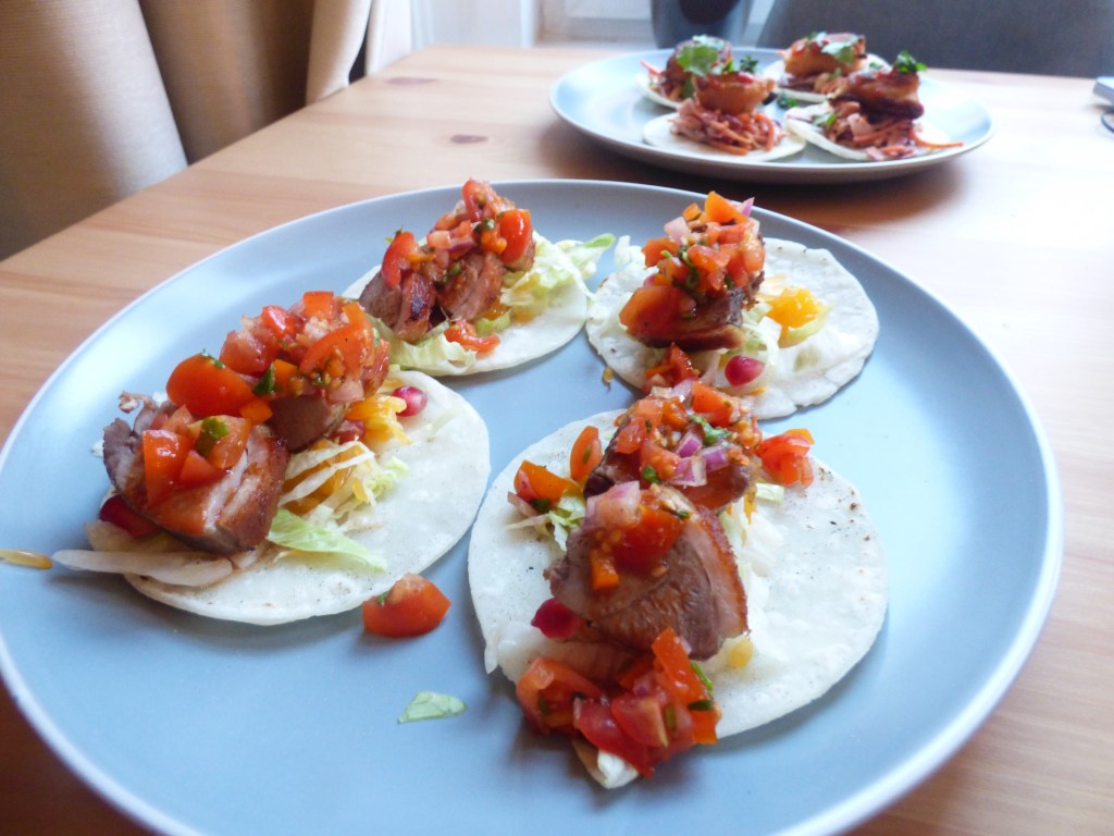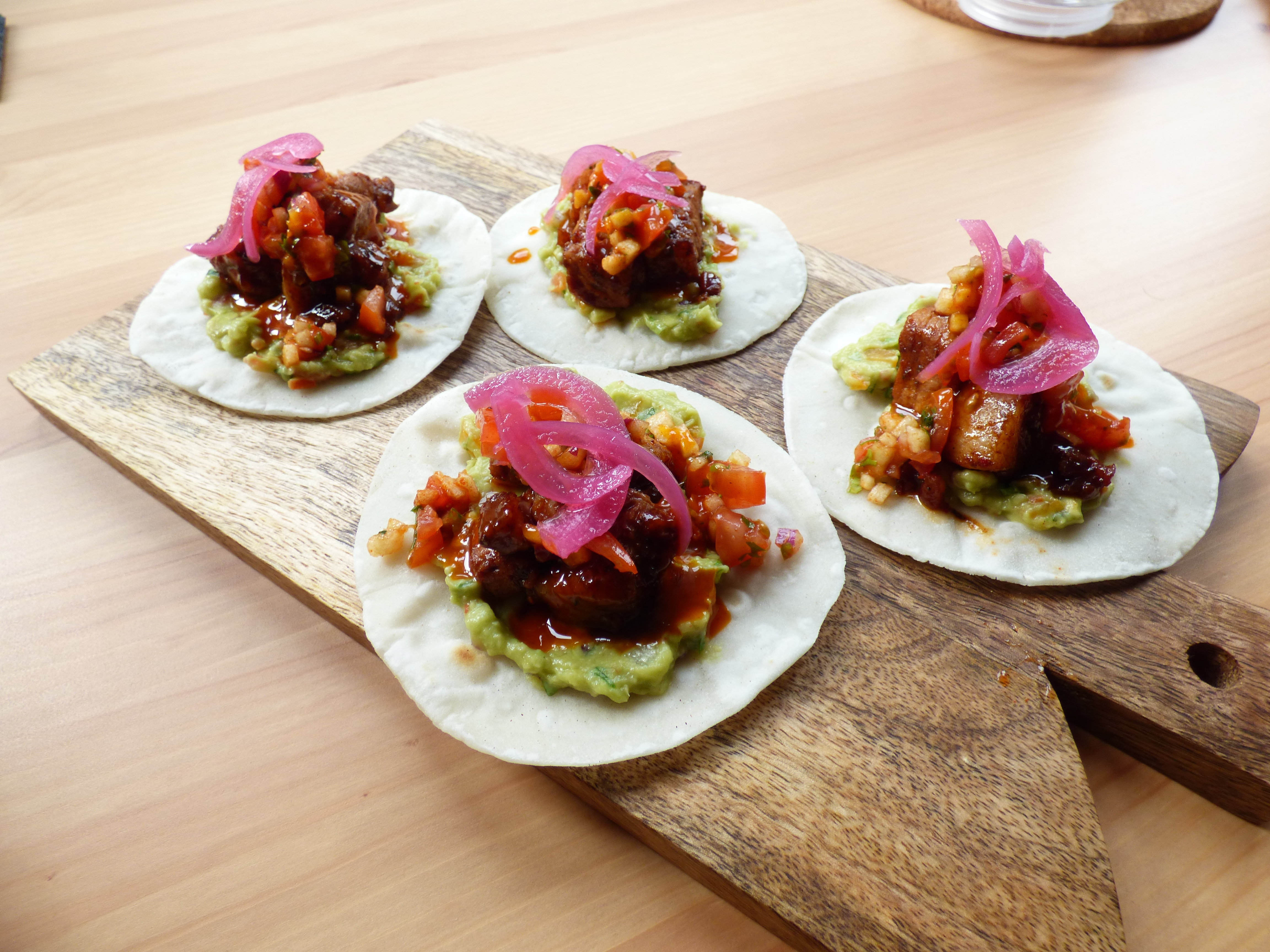 Here I have made pork tacos with an apple salsa, guacamole, pink pickled onions and habanero hot sauce.
