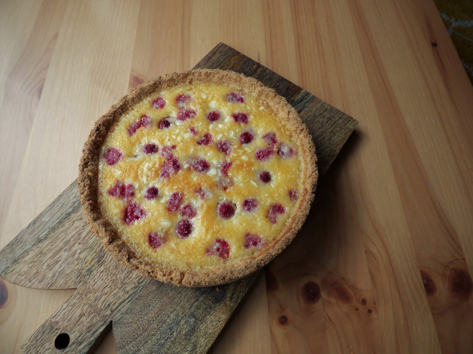 - Place some whole raspberries into your tart case and then pour over your filling. Then scatter some pieces of chopped raspberry over the top. This will help to ensure that the chopped raspberries don’t sink.