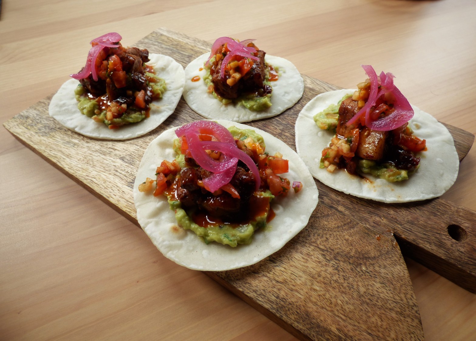 - Now it is time to assemble the tacos. Place a dollop of the guacamole on each taco and spread slightly. Top this with a few pieces of the pork and a then a spoonful of the salsa.
