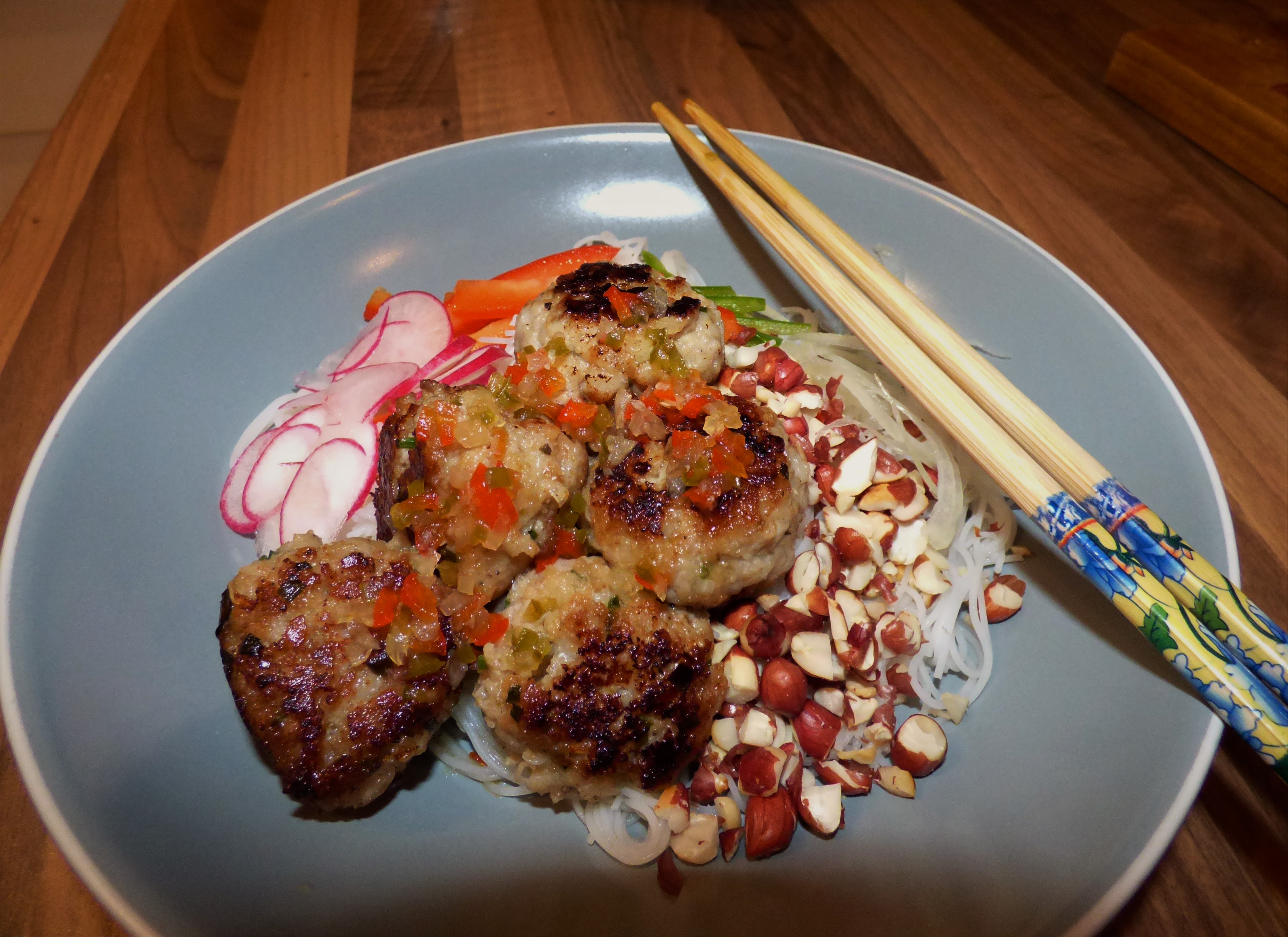 - Place a portion of the noodles in each bowl. Top with 4-5 meatballs per person, and top this with the dressing (Lots of the dressing!!!). Add all of your vegetables and your nuts, and you are ready to serve!