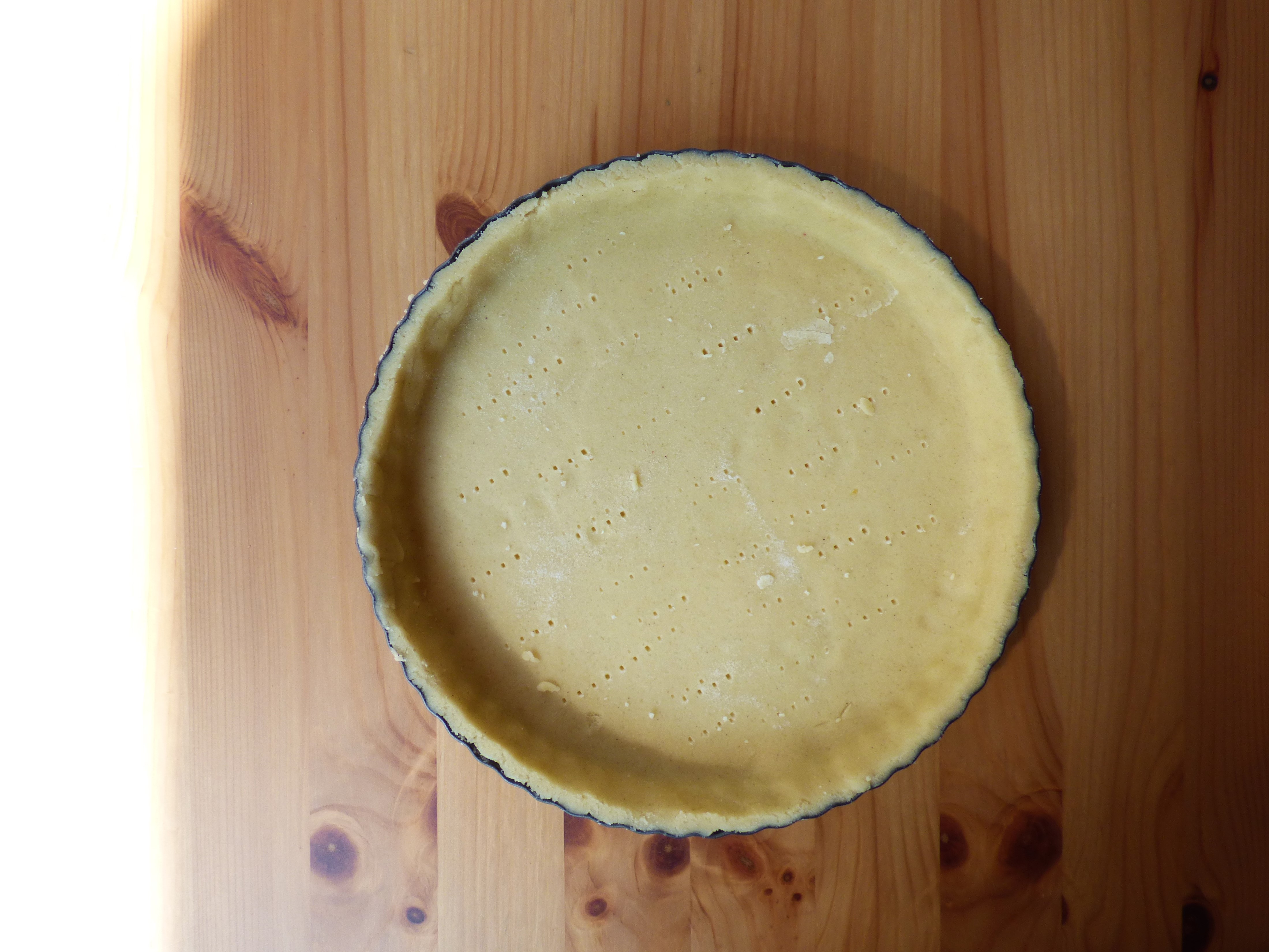- Make the pastry following the steps for blind baking in the basic gluten free shortcrust pastry recipe, making sure to use the optional sugar and rolling out the dough to around 0.5cm thickness. Preheat your oven to 180°C and leave the rolled out dough in the pie tin in the fridge while you prepare the fillings.