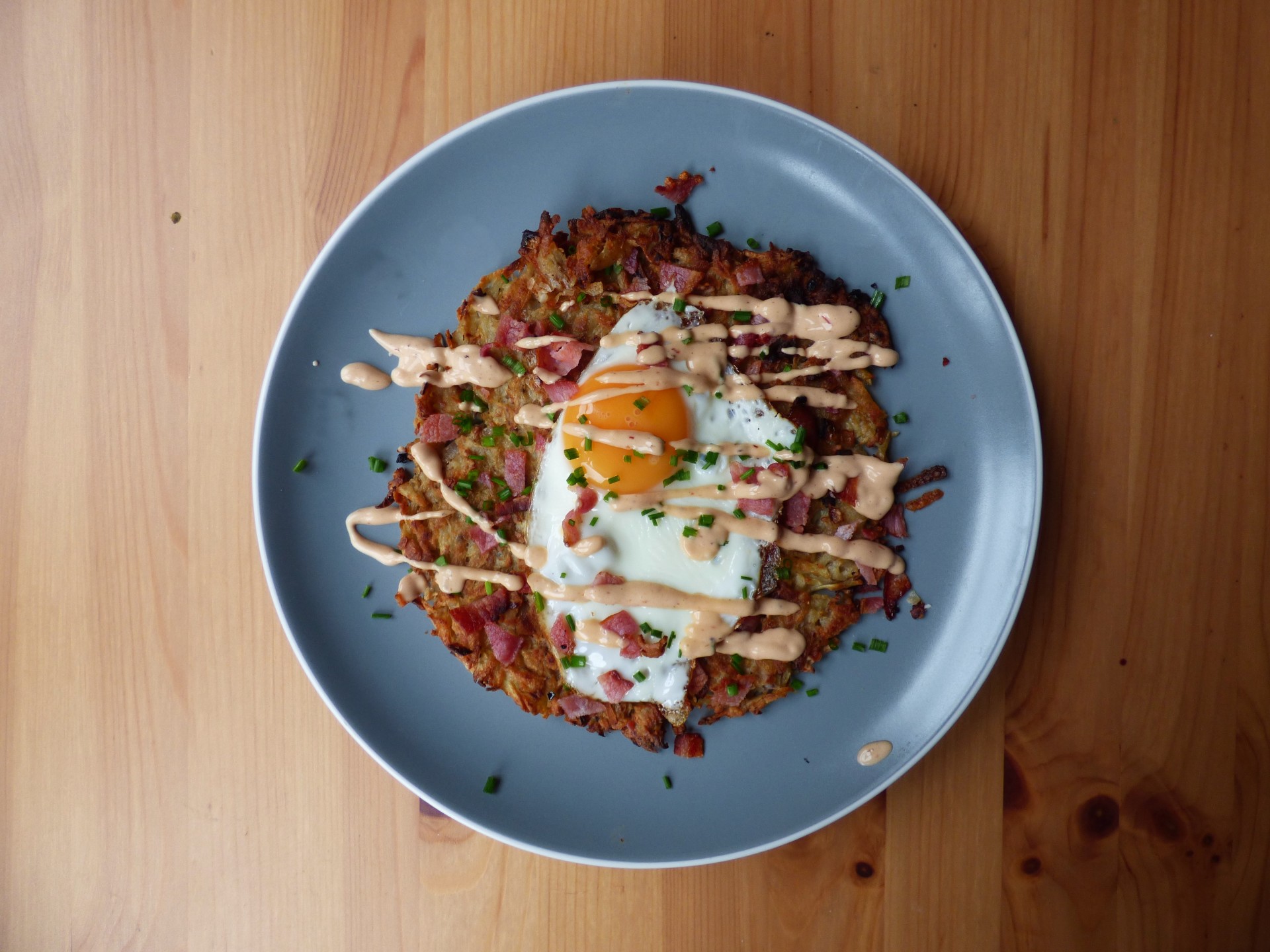 10. Place your hashbrown on a plate and top with the fried egg, sprinkle the bacon bits and chives over the top and then pipe over the sauce.