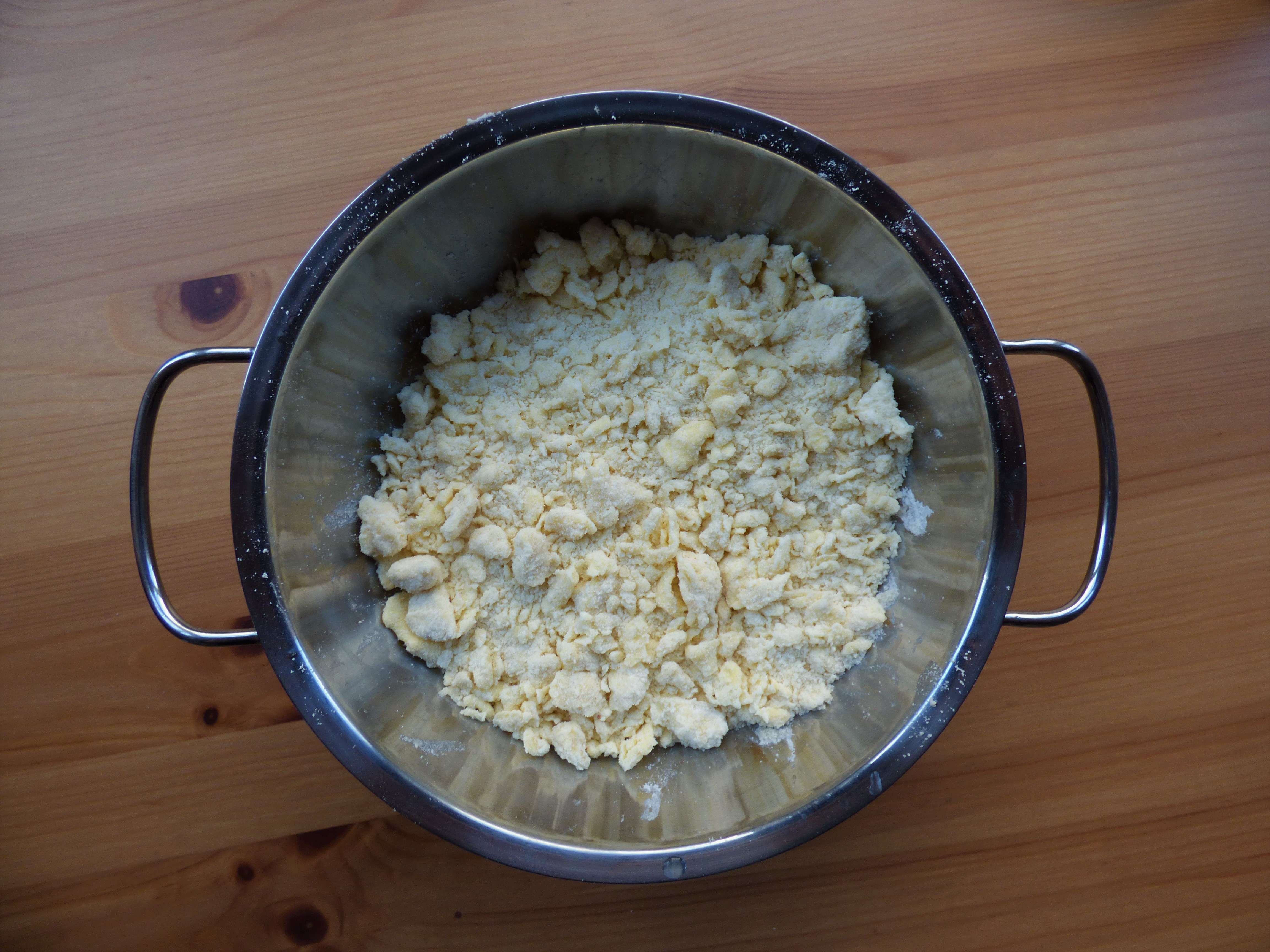 - Take your grated butter out of the freezer and add around two thirds to the bowl. Rub this with your fingers until all of the bits of butter are coated in flour but are not completely incorporated. You want a sort of rough looking mixture where you can see bit of butter coated in flour like in the image to the left.