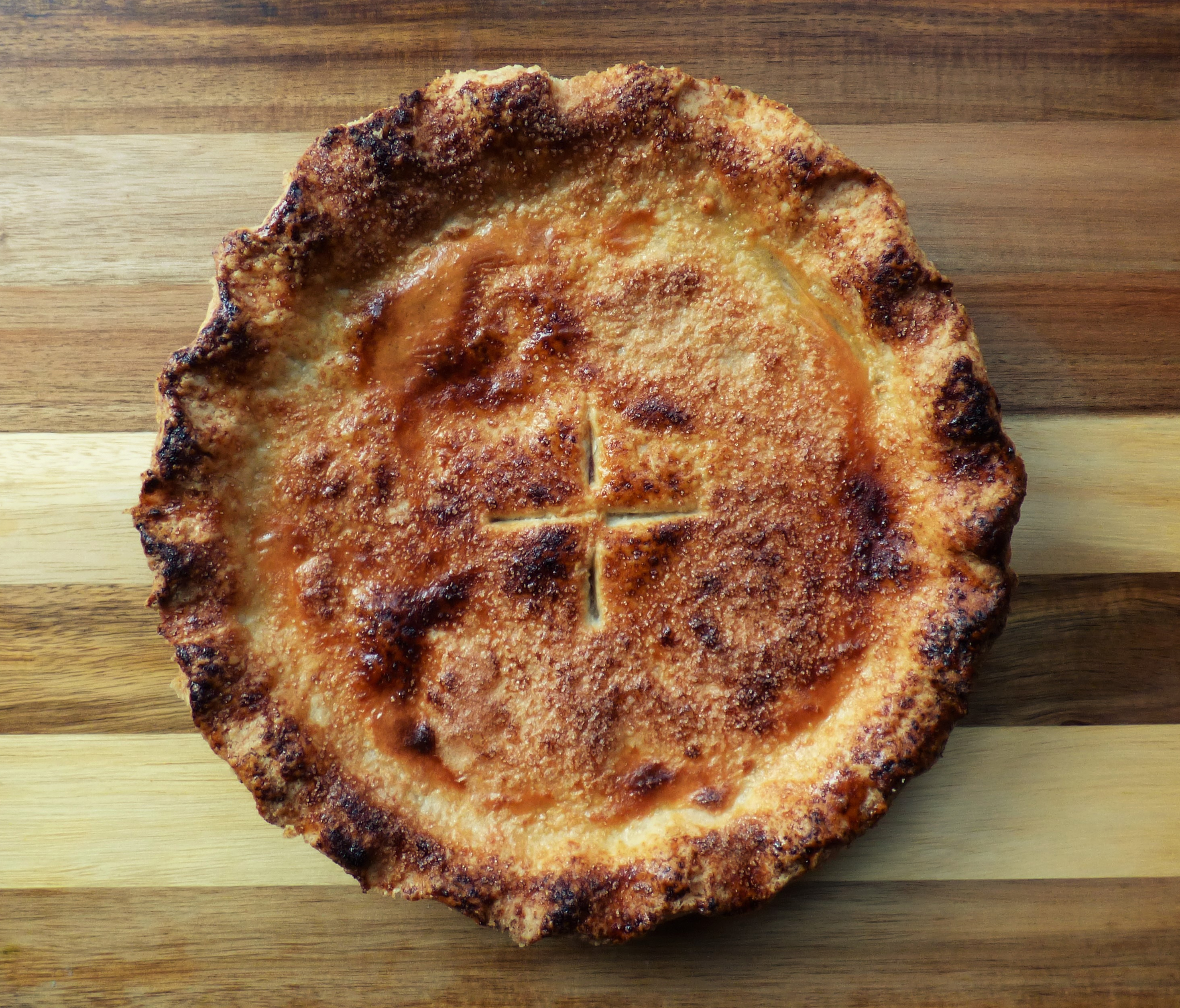 - Pour your filling into the pie and top with the second disk of pastry. Brush with the egg wash and sprinkle with some flaky salt. Peirce 4 knife holes into the top.