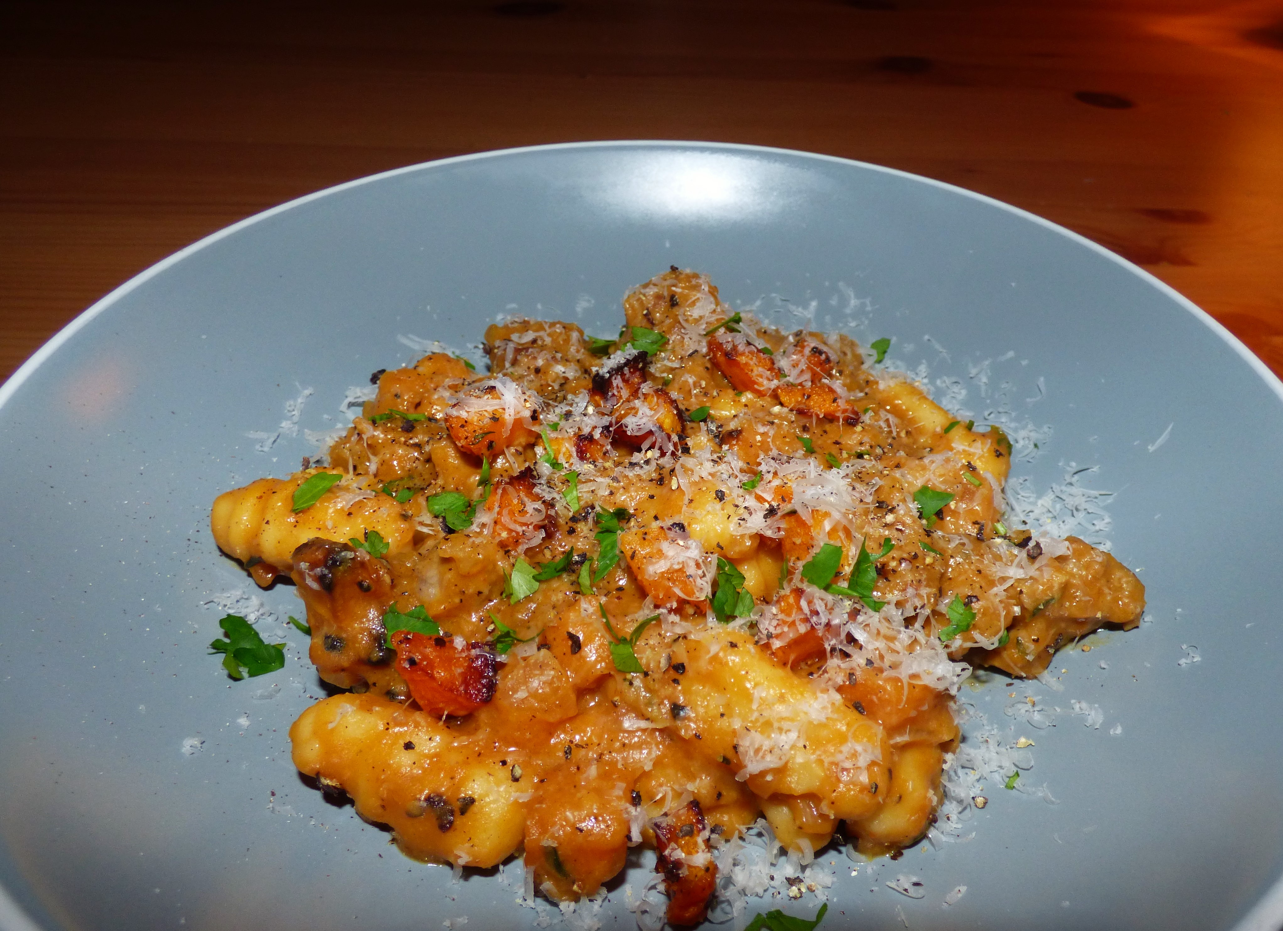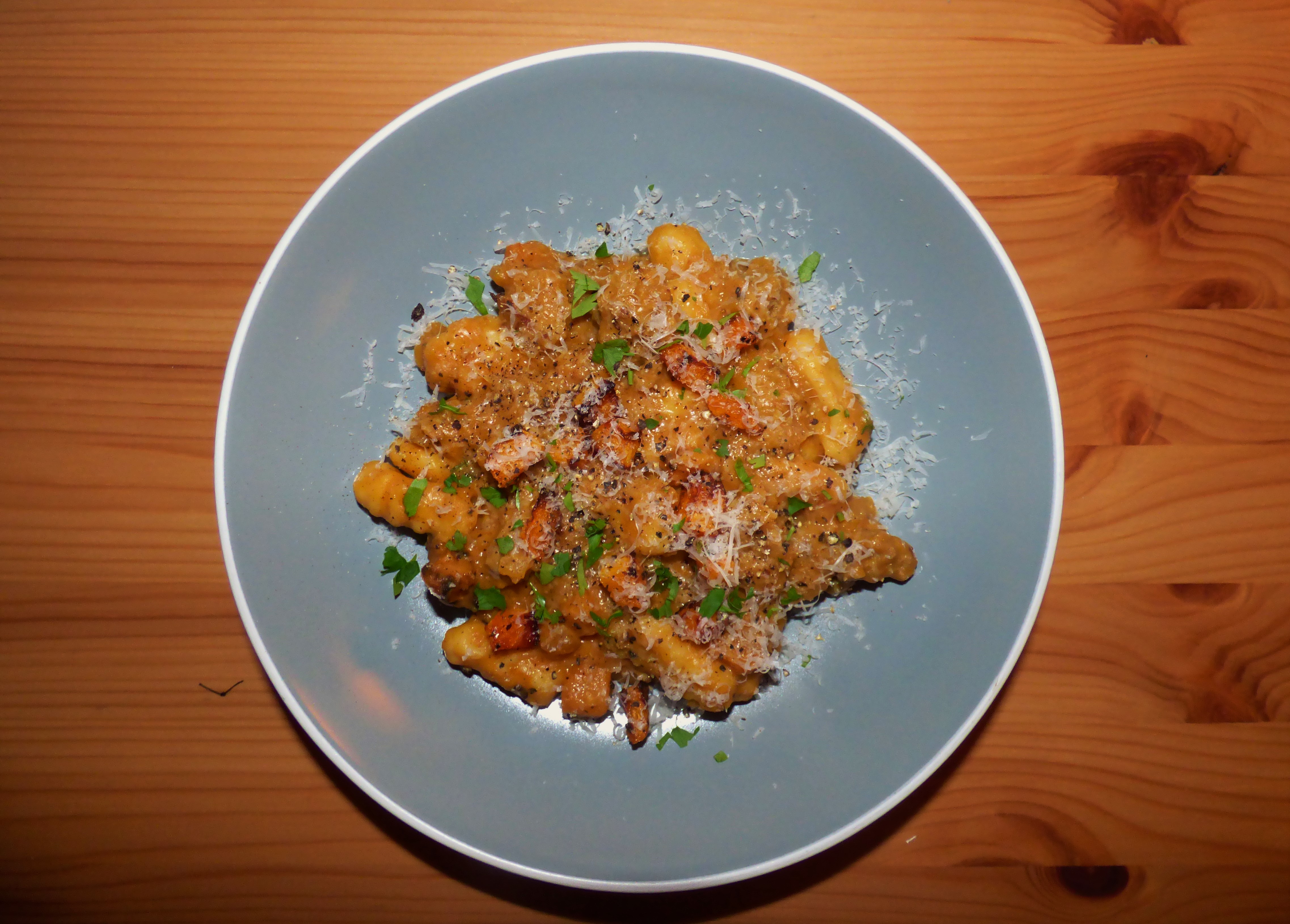 - Add the cooked gnocchi to the frying pan and cook there for 1-2 minutes before adding the squash pure. If the sauce seems a bit thick add some cooking water until you have the thickness you like.