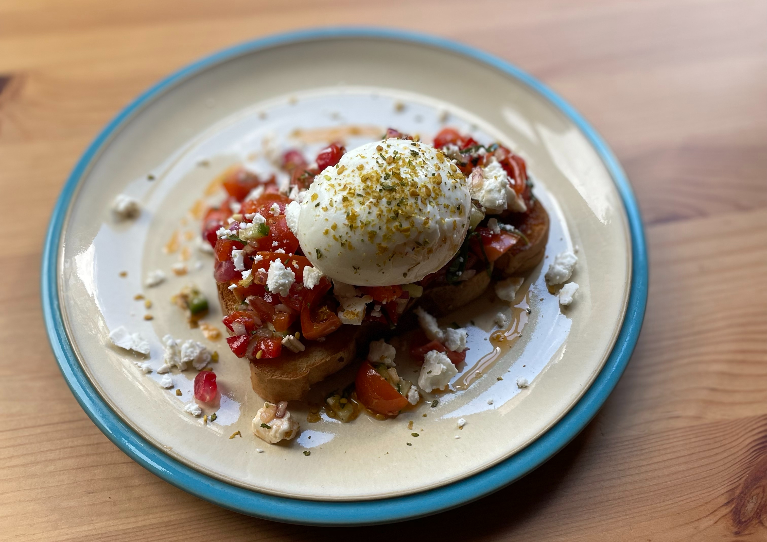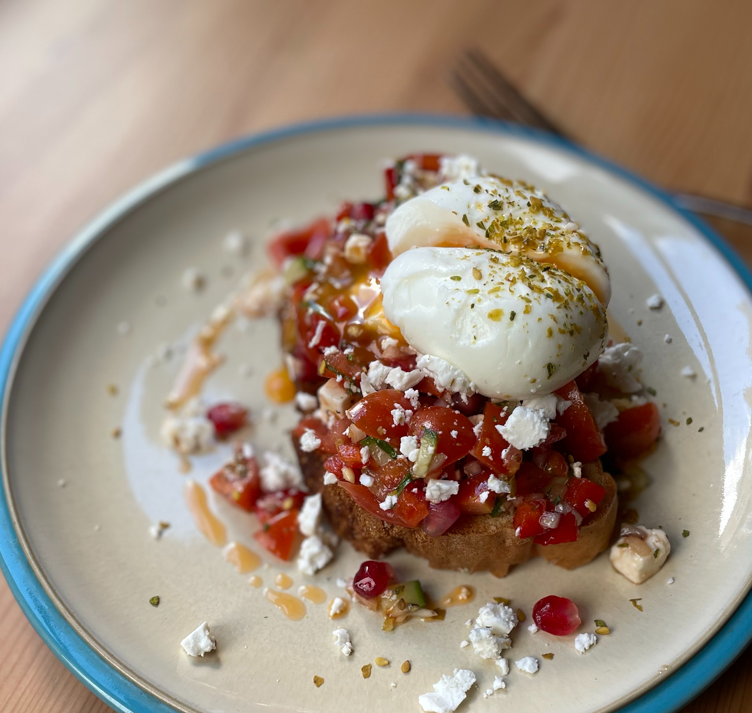 This recipe is perfect for a summer brunch and is super easy to make in large quantities for guests. It’s a sort of take on bruschetta while using middle eastern flavours and adding a beautifully runny boiled egg on top.