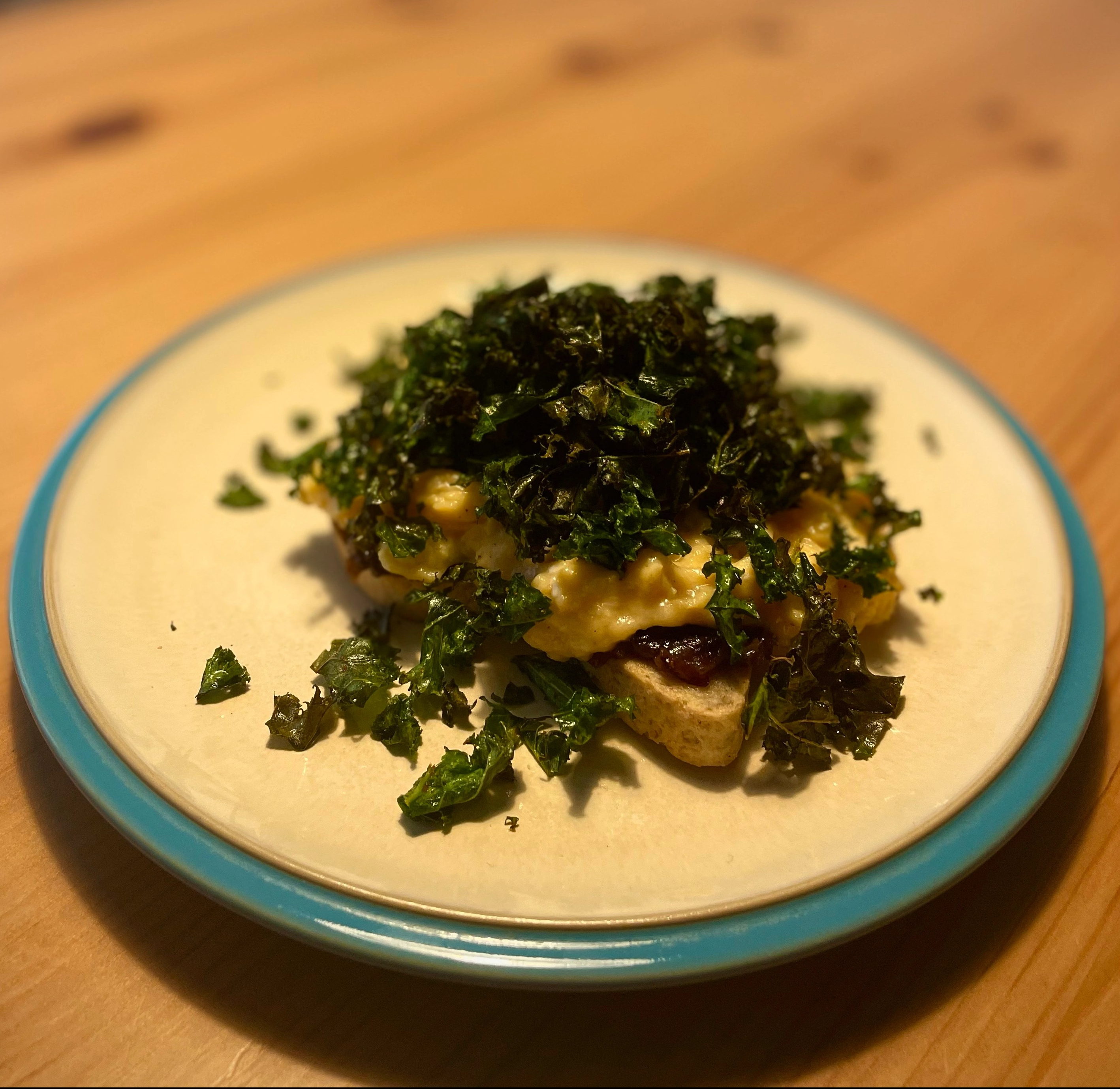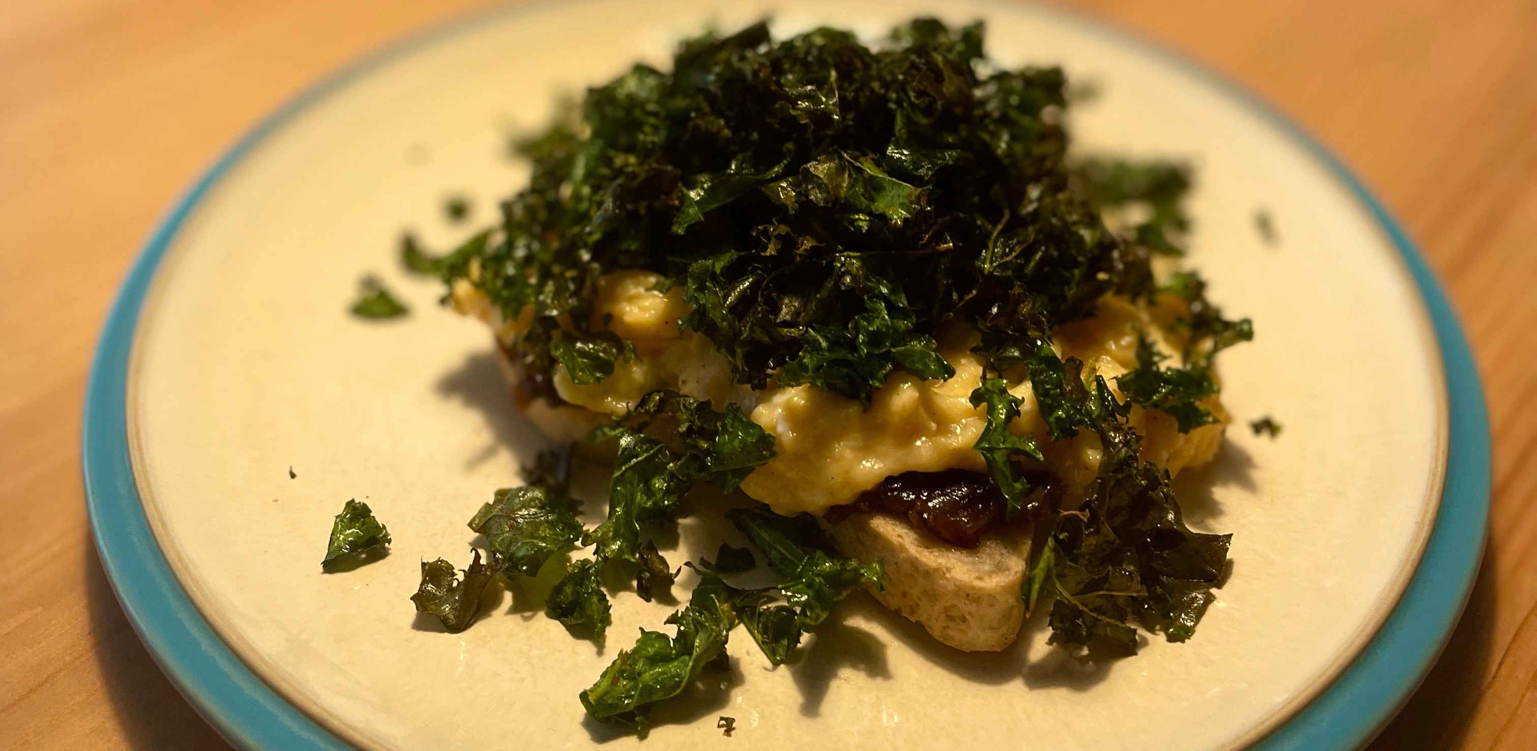 - Spread your caramelised onions evenly over the toast. Top with the cheesy scrambled eggs and then the crispy kale and enjoy!