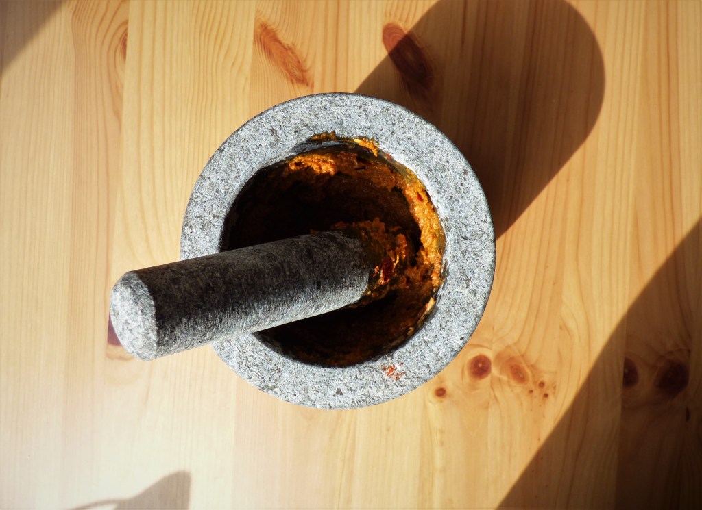 - Next you need to prepare your curry paste, for this you will need a pestle and mortar, or a spice grinder. Firstly, add your whole spices to the mortar and grind them up. Now add your garlic, chilli, ginger, onion, salt, and pepper to the mortar. Bash and grind these up into a rough paste. Now add all of the rest of your spices along with the oil and continue to bash and grind into a paste. There will be a few lumps of things like chilli pepper skins, but this is fine.