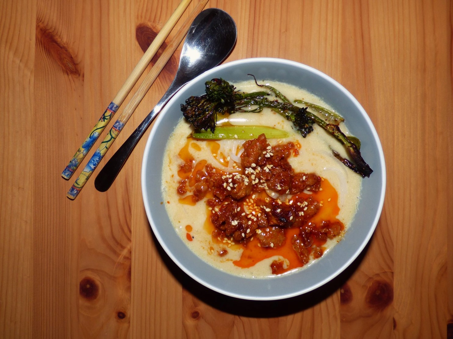 Tan tan ramen is a Japanese dish that consists of a creamy broth flavoured with a sesame tare and topped with spicy pork and chilli oil. For all of us gluten free folk, ramen noodles are a no go and we have to stick generally to rice noodles and soba noodles. This recipe is a gluten free take on the traditional tan tan ramen. It’s so delicious and satisfying, you’ve got to try it!
